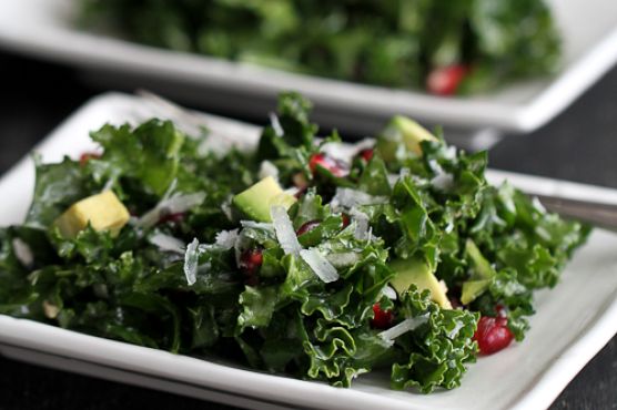 In a large bowl, combine the kale, pomegranate seeds, avocado and Parmesan cheese. Toss gently.In a small bowl, whisk together the lemon juice, olive oil, agave nectar (or honey), salt and pepper.
