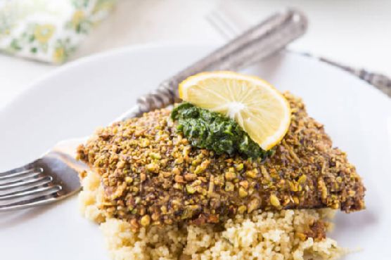 Lay fillets onto a baking sheet lined with parchment paper. Coat the top side of the salmon fillets with the pistachio mixture.