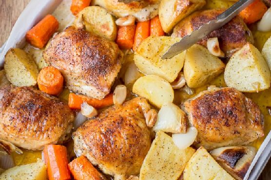 Place in the oven and bake for 1 hour 20 minutes. Check for doneness -if the potatoes and chicken thighs are soft and easily pierced with the fork they are ready.If the chicken and potatoes have not browned up as much as you would like, turn the broil setting on and broil for 5 minutes. Watch carefully, or they will burn.