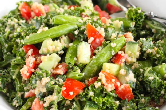 Place the kale in a colander and run warm water over it while massaging the leaves until the kale softens.In a large bowl, combine the kale, cucumber, snap peas, tomatoes and quinoa. Toss with the dressing.