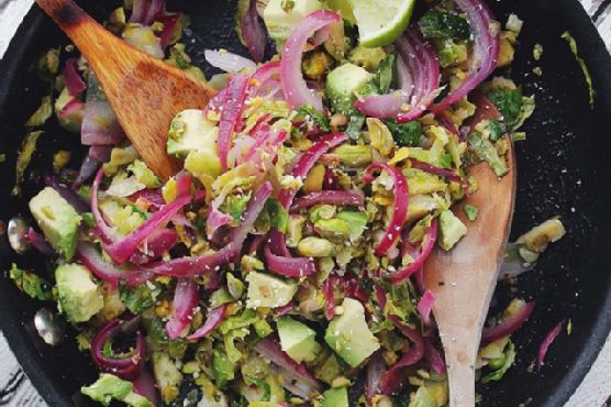 Add brussels sprouts and onion to the pan.Season with salt and pepper; saute for 3 to 4 minutes, or until tender.Stir in sugar, pistachios, and lime juice.Continue to cook for 2 more minutes.
