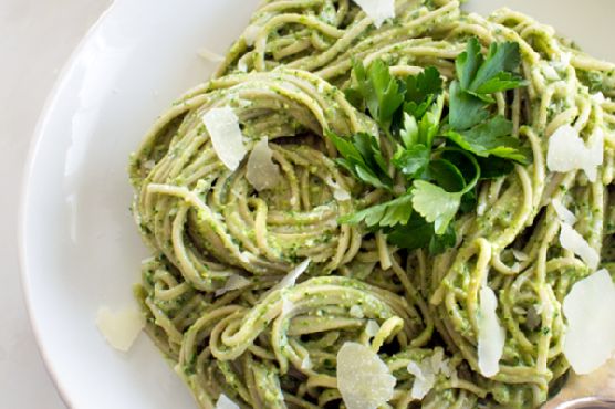 Serve immediately. The pesto can also be stored in a jar or air-tight container with a layer of olive oil on top for up to a week.