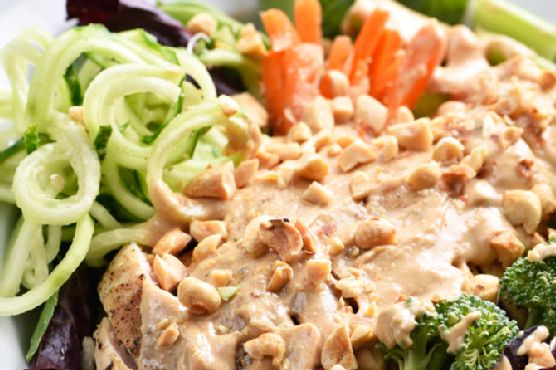 Add a baked chicken breast to each salad and top with peanut sauce and chopped peanuts.
