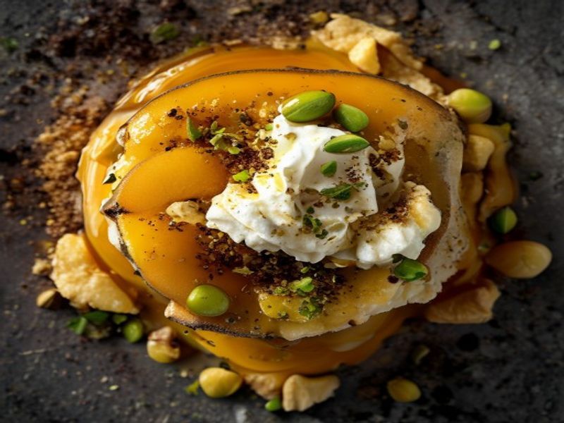 A sophisticated dessert featuring tender Bosc pears infused with aromatic saffron, paired with velvety honey-whisked mascarpone and a crunchy, salted pistachio crumble.