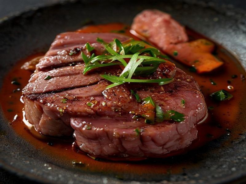 Final Touch: Drizzle the Spicy Jus around the perimeter of the beef. Garnish with micro-cilantro and a final dusting of Togarashi for visual impact and an extra kick of heat.