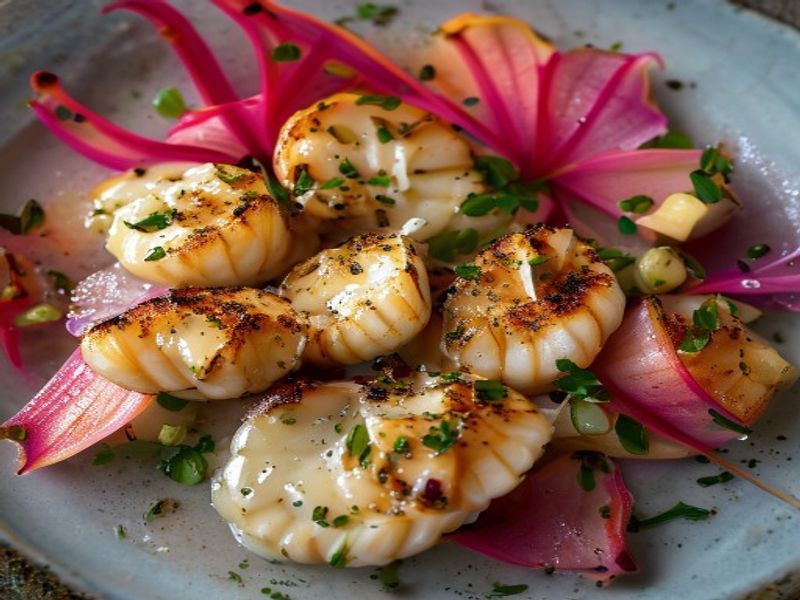 Pan-Seared Scallops with Macadamia...Pan-Seared Scallops with Macadamia Mole Blanco & Hibiscus-Pickled Dragon Fruit