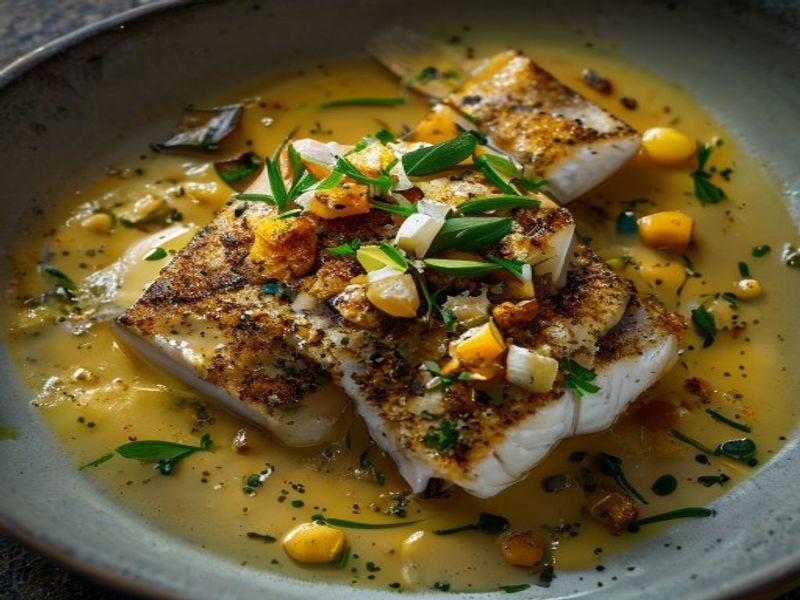 A refined Mediterranean masterpiece featuring crisp-skinned sea bass over a silky, saffron-infused fennel emulsion, finished with the salty intensity of shaved Bottarga and lemon-toasted panko.