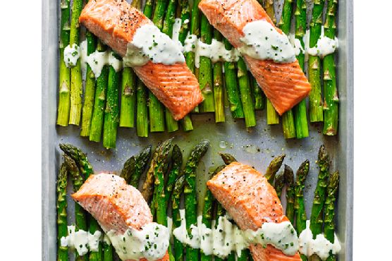 Season salmon with remaining 1/2 tsp. salt and 1/4 tsp. pepper, then set on top of asparagus in a single layer.