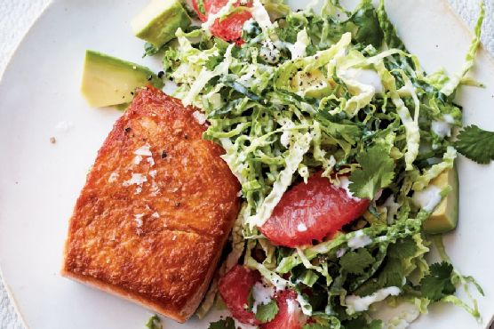 Add the grapefruit segments, avocado, and cabbage and toss gently to combine; season with salt and pepper. Top the slaw with cilantro and serve alongside the salmon.