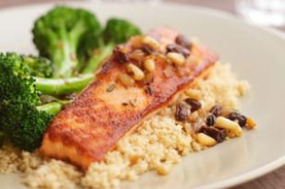 Add salmon, skinned-side up, and cook until golden brown, 3 to 5 minutes. Turn the salmon over, remove the pan from the heat and let stand until just cooked through, 3 to 5 minutes more.To serve, divide the broccoli among 4 plates. Top with salmon and spoon raisins, pine nuts and any liquid remaining in the pan over the salmon.