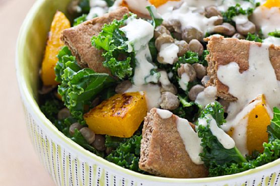 Add salt and pepper to taste.Divide kale, butternut squash, lentils, and pita chips into servings bowls or plates and serve with tahini dressing.
