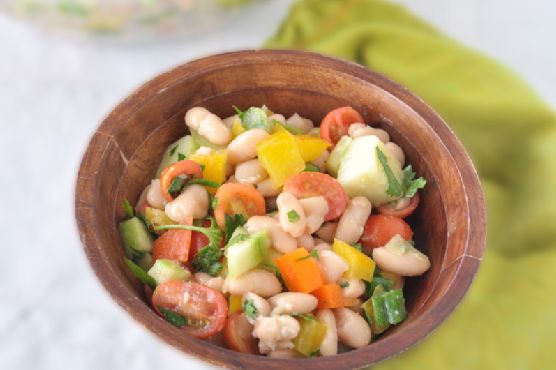 If you use dried white beans, like we do, soak overnight first. Rinse, drain, and boil to soften.Rough chop the bell peppers.Slice the cherry tomatoes.Chop the green onions.Peel, de-seed, and chop the cucumber.Chop the parsley.