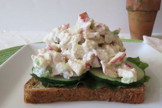 Mix carefully until combined.On a piece of bread add lettuce and cucumbers and top with chicken salad and top with other pices of bread