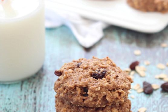 Add in peanut butter and mix together. Continue adding the Truvia, vanilla, oats, cinnamon, flour, milk, baking soda and raisins. Lightly mix until blended.Drop by tablespoon (I used a cookie scoop) onto cookie sheet. Get the bottom of a cup wet with water and smash each cookie down into a flat circle.