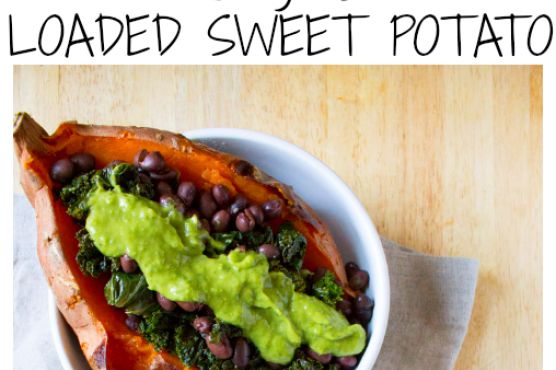Cut sweet potatoes in half lengthwise. Top with black beans, kale, and the Green Goddess Dressing.