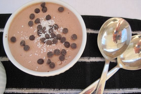 Place crust ingredients in a food processor and puree until well combined.Put crust mixture into 4-5 ramekins (or mugs if you do not have ramekins). Press the crust down with fingers or a spoon.Now place mousse ingredients (minus the chocolate chips and shredded coconut) in the food processor and puree until smooth.