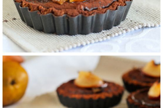 Remove from oven and allow to cool for 15-20 minutes. While the shells are cooling, add all the ingredients of the filling to the bowl of your food processor and process until smooth and well incorporated, about 3-4 minutes. Try not to eat it all right then and there!Cover the bottom of each empty pie shell with dices of caramelized pear. Spoon a few tablespoons of chocolate filling on top and spread to smooth as best as you possibly can. Dust the tartlets with dark cocoa powder and decorate with half slices of caramelized pears, if desired. Refrigerate for 4-6 hours before serving. These tartlets will keep for 4-5 days in the refrigerator.