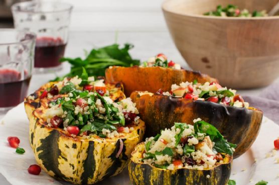 Quinoa Salad Stuffed Acorn Squash takes about 45 minutes from beginning to end. This recipe makes 8 servings with 290 calories, 5g of protein, and 7g of fat each. For $2.03 per serving, this recipe covers 24% of your daily requirements of vitamins and minerals. It works well as a hor d'oeuvre. Many people made this recipe, and 158 would say it hit the spot. This recipe from Love & Lemons requires acorn squash, apple, spinach, and quinoa. It is a good option if you're following a gluten free, dairy free, lacto ovo vegetarian, and vegan diet. With a spoonacular score of 99%, this dish is excellent. Users who liked this recipe also liked Quinoa Stuffed Acorn Squash, Quinoa Stuffed Acorn Squash, and Gingery Quinoa-Stuffed Acorn Squash.