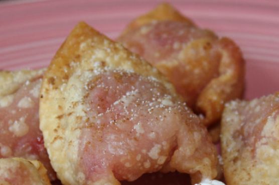 Lay out wonton wrappers on wax paper and place a small amount of strawberries on the center of the wonton wrapper.Get a small bowl of water and place where you will be working. Dip your finger into the water and line the edge of the wonton wrapper with water. Fold wonton wrapper into a triangle and seal the edges by pinching the edges together. Take the two furthest points and bring together and seal with another dab of water. Pinch tightly to get a good seal.