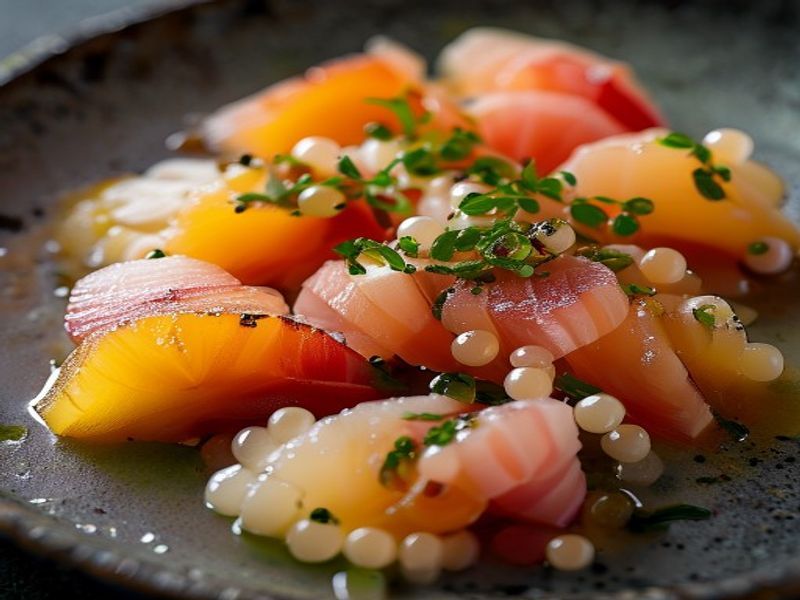 A sophisticated, Michelin-inspired appetizer featuring sashimi-grade yellowtail, vibrant yuzu, and molecular soy pearls for a burst of umami.