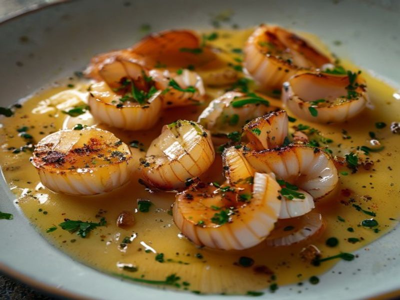 Buttery, pan-seared scallops served over a silky smoked parsnip purée, finished with a vibrant spicy chorizo-infused oil and delicate micro-herbs.