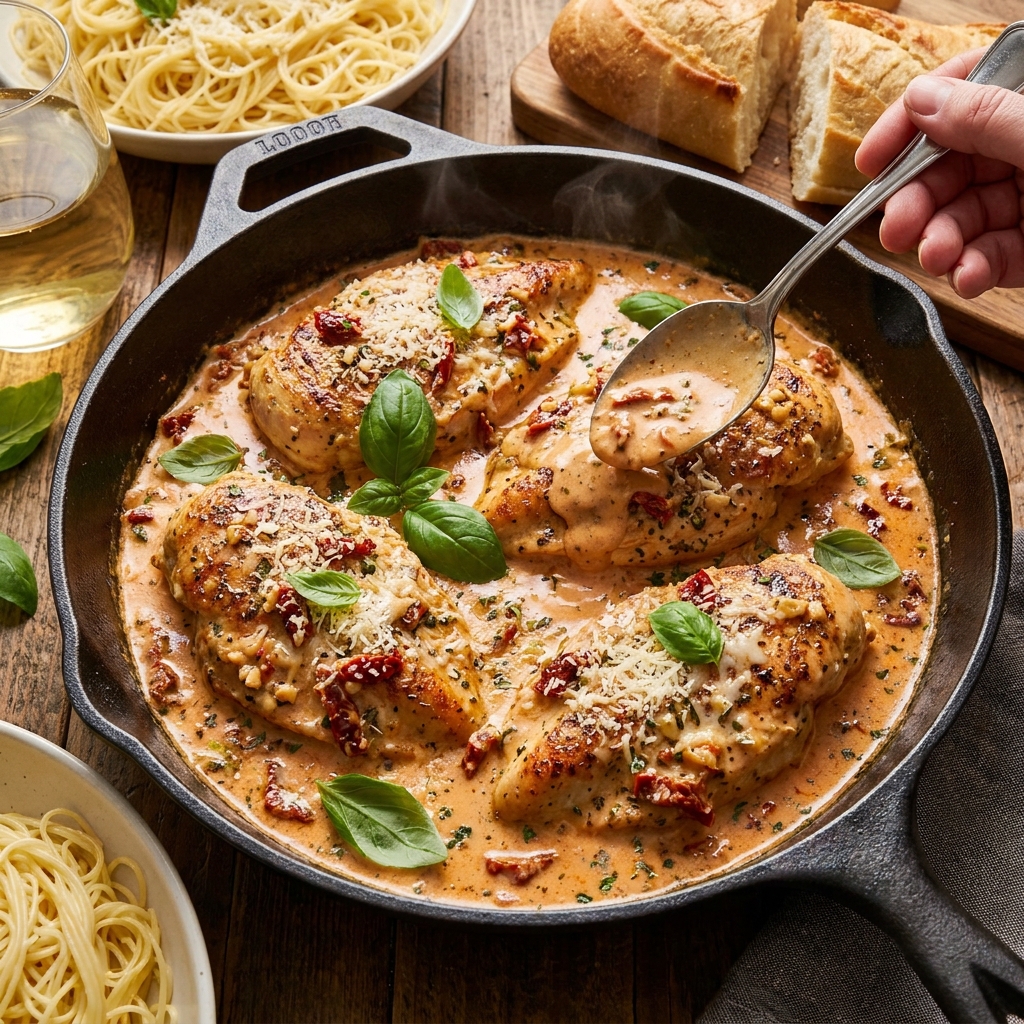 A luxuriously creamy chicken dish featuring sun-dried tomatoes, garlic, and parmesan in a velvety sauce that's so irresistible, it'll inspire a marriage proposal.
