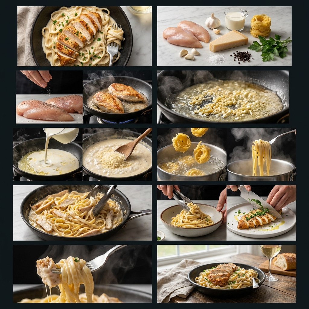 A luxuriously creamy pasta dish featuring tender chicken breast, roasted garlic, and authentic Parmigiano-Reggiano in a velvety sauce that coats every strand of pasta perfectly.