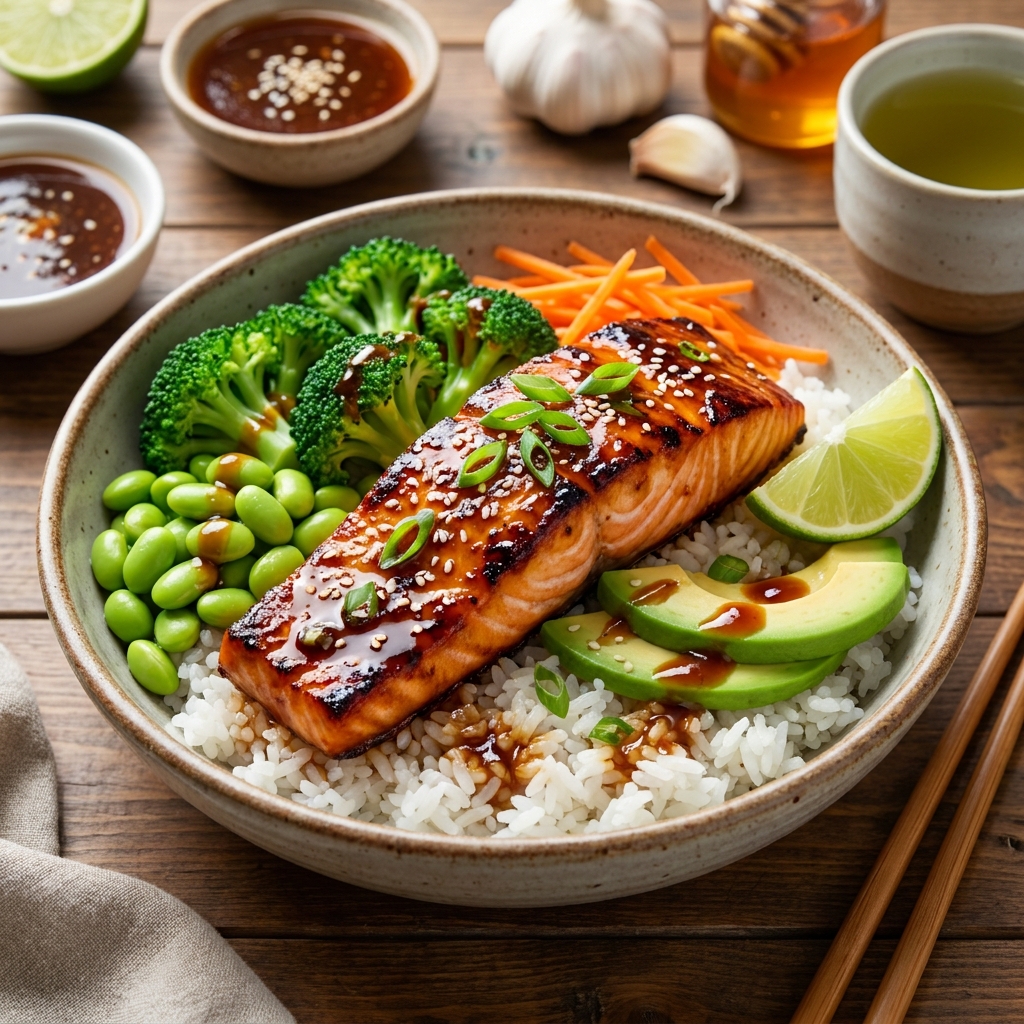 A mouth-watering salmon bowl featuring perfectly seared salmon glazed with a luscious honey garlic butter sauce, served over fluffy rice with crisp vegetables and a sprinkle of sesame seeds.