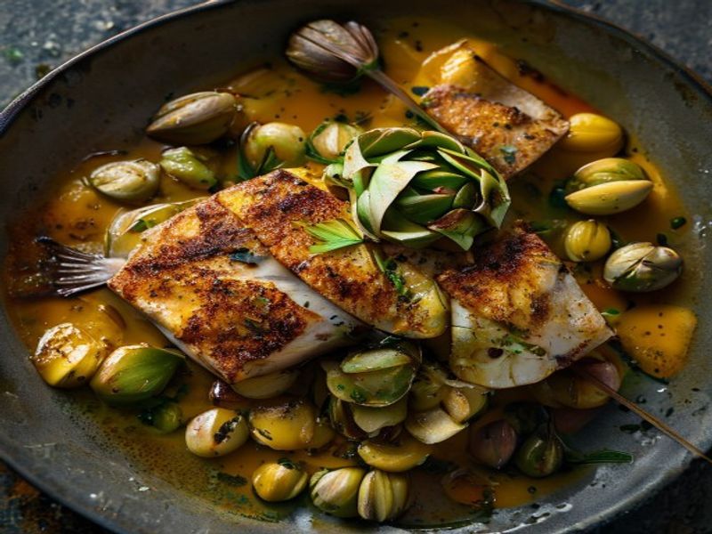 A refined pan-seared wild seabass served atop a fragrant artichoke and fennel barigoule, finished with a bright pine nut gremolata and a delicate saffron-infused broth.