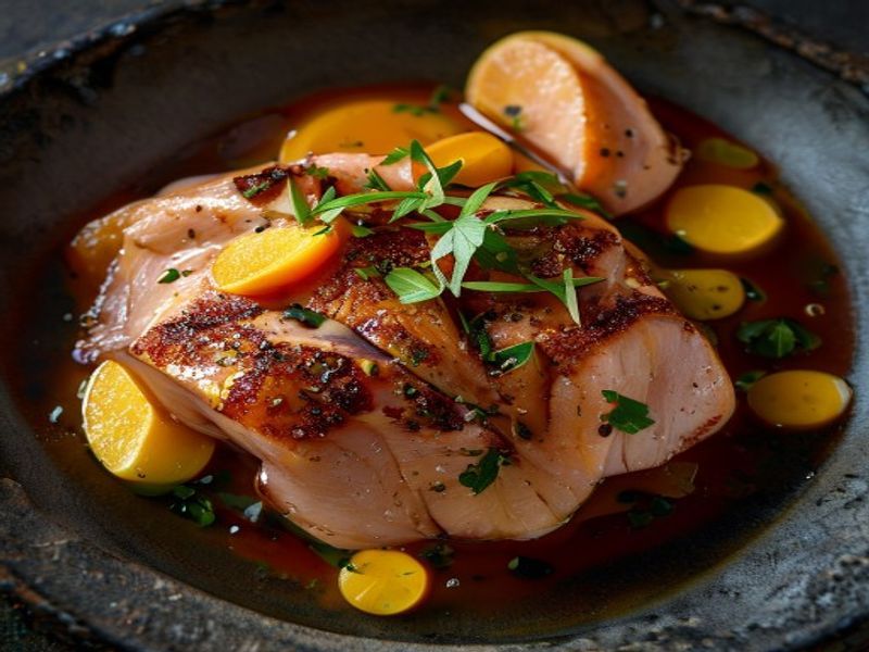 A refined interpretation of pan-Asian flavors featuring succulent duck breast finished with a bright citrus glaze, served over a velvet-smooth parsnip purée and garnished with crispy shiitake 'earth'.