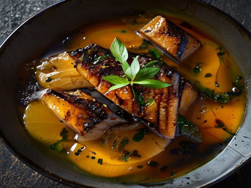 A sophisticated balance of buttery black cod marinated in white miso, served in a bright, aromatic ginger-infused yuzu dashi with charred greens and pickled radish.