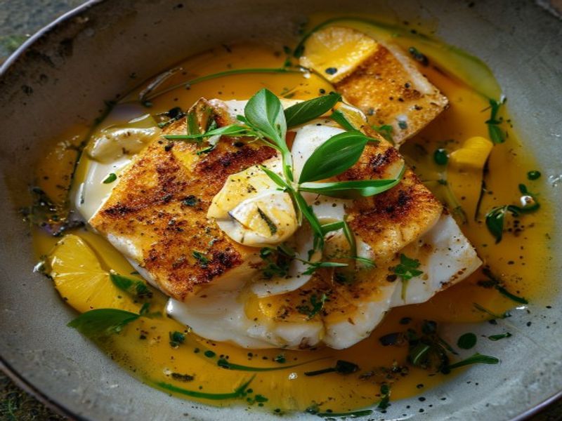 A sophisticated Mediterranean seafood dish featuring tender saffron-infused branzino served over a velvety vanilla-scented fennel purée and finished with a vibrant herb-citrus oil.