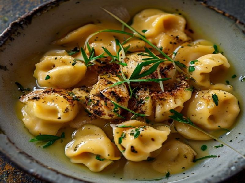 Gently toss the cooked pasta in a small amount of the emulsion to glaze. Plate 5-7 tortellini per person, spoon over the remaining sauce, and garnish with fennel pollen and micro-greens.