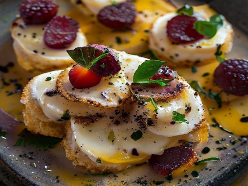 An avant-garde quick snack featuring aerated whipped burrata infused with black truffle, balanced by yuzu-macerated blackberries on fire-toasted sourdough.