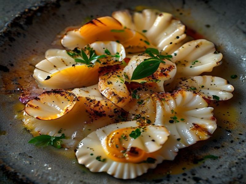 Arrange the scallop discs on a chilled plate. Using a kitchen blowtorch, lightly char the surface of the scallops for 5-10 seconds until just fragrant but still raw in the center. If a torch is unavailable, sear one side in a smoking hot dry pan for 30 seconds.