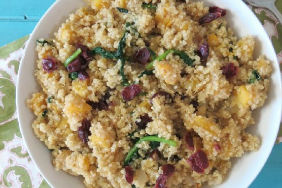 Add quinoa to the skillet, mix until incorporated. Stir in cranberries and place in serving bowl.