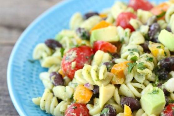 Pour dressing over pasta salad and stir until salad is well coated. Season with salt and pepper. Squeeze fresh lime juice over the salad, so the avocados don't brown.