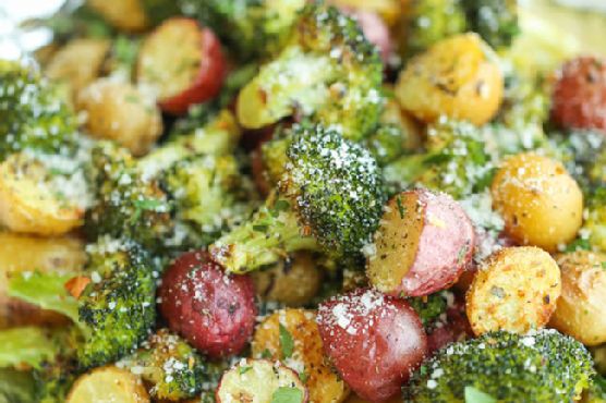 Cut four sheets of foil, about 12-inches long. Divide broccoli and potatoes into 4 equal portions and add to the center of each foil in a single layer.Fold up all 4 sides of each foil packet. Spoon the garlic mixture over the broccoli and potatoes.Fold the sides of the foil over the vegetables, covering completely and sealing the packets closed.