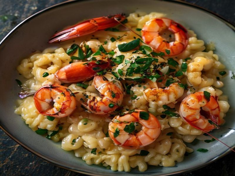 While the risotto cooks, lightly sear the red prawns in a separate pan with a touch of olive oil for only 30 seconds per side; the centers should remain slightly translucent to preserve their delicate texture.