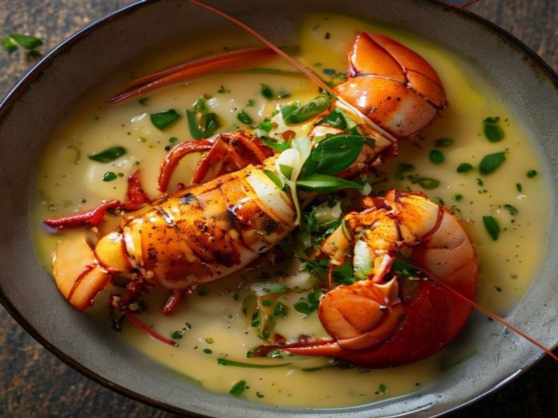 Place the lobster tails in the center of two warmed shallow bowls. Carefully pour the lemongrass consommé around the lobster.