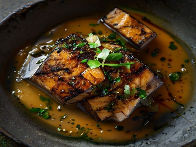 Succulent, buttery black cod marinated in a traditional saikyo miso blend, served with a vibrant ginger-scallion emulsion and delicate lotus root crisps.