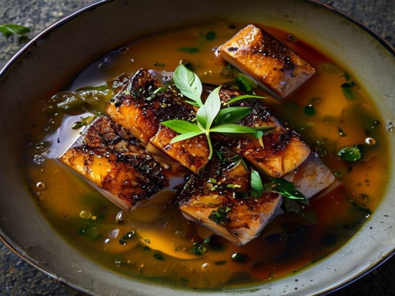 A sophisticated fusion of buttery black cod, caramelized with white miso and wild honey, resting in a fragrant lemongrass-ginger dashi broth, accented by crisp pickled shimeji.
