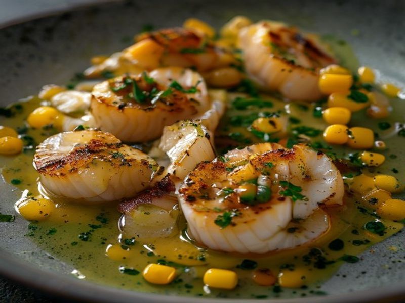 A sophisticated fusion of coastal Mexican flavors featuring butter-basted scallops over a vibrant toasted pumpkin seed mole and a velvety smoked corn purée.
