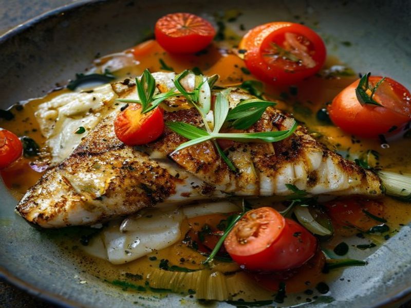 Home / Recipes / Pan-Seared Wild Sea Bass with Saffron-Infused Fennel Silk & Blistered Heirloom Tomatoes