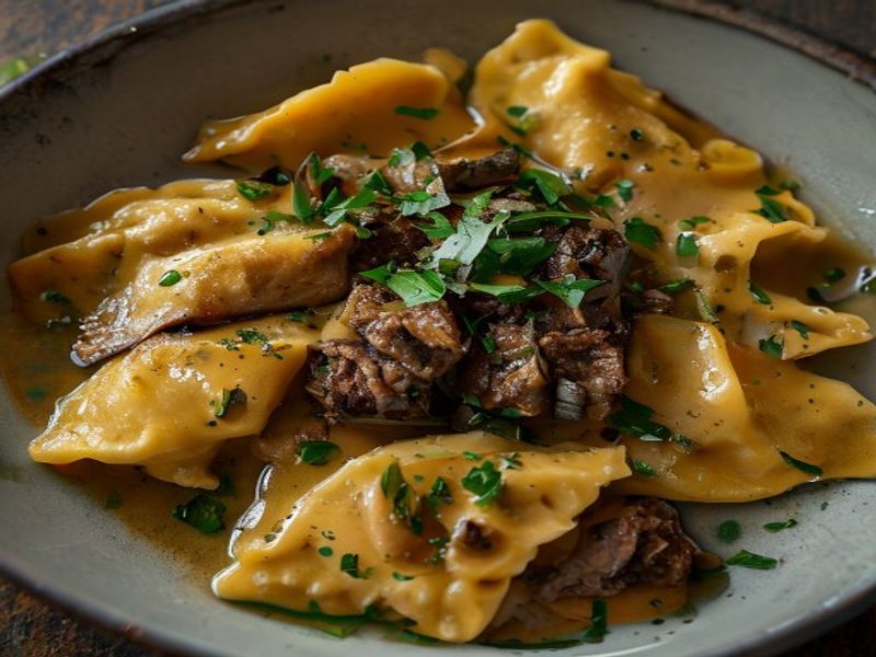 Delicate saffron-infused pasta pillows filled with 12-hour slow-braised veal shank, finished with a bright lemon-parsley emulsion and brown butter.