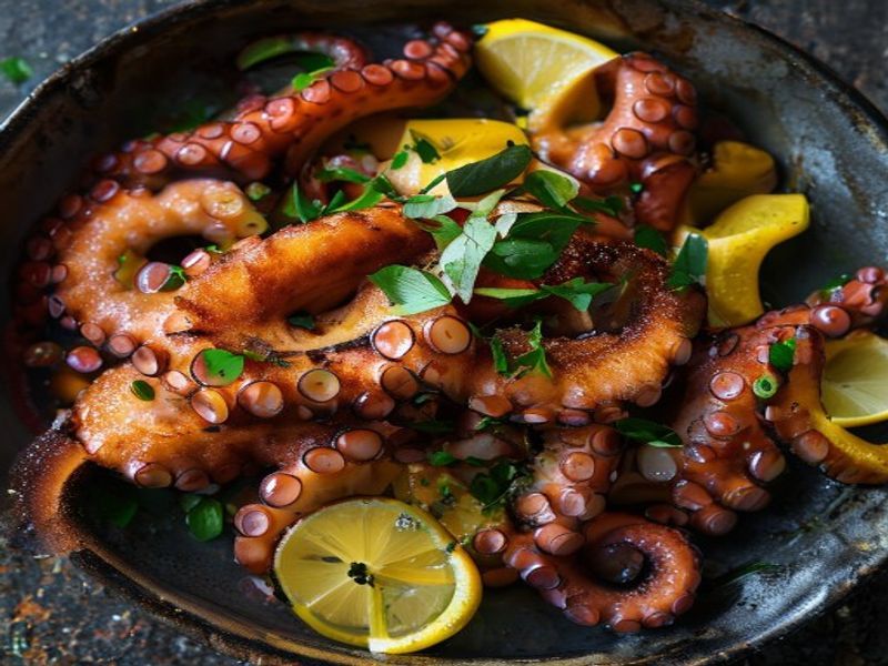 Home / Recipes / Saffron-Braised Octopus with Crispy Chickpea Panisse and Preserved Lemon Gremolata