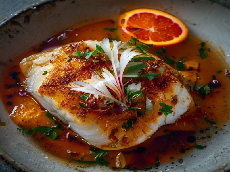 Home / Recipes / Saffron-Poached Chilean Sea Bass with Shaved Fennel and Blood Orange Reduction